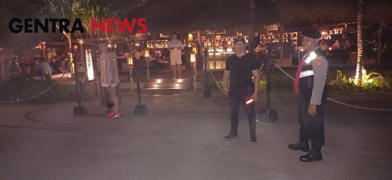 Tampak Personel Unit Samapta Polsek Kuta Utara hadir memberi rasa aman bagi para pengunjung saat menikmati suasana hiburan malam di Yuki Restauran, Maxicola, Old Man bar dan tempat hiburan lainnya di kawasan wisata Batu Bolong.
