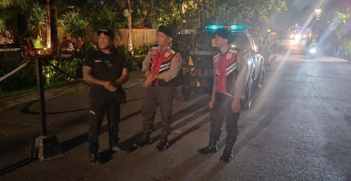 Tampak Personel Unit Samapta Polsek Kuta Utara hadir memberi rasa aman bagi para pengunjung saat menikmati suasana hiburan malam di Yuki Restauran, Maxicola, Old Man bar dan tempat hiburan lainnya di kawasan wisata Batu Bolong.