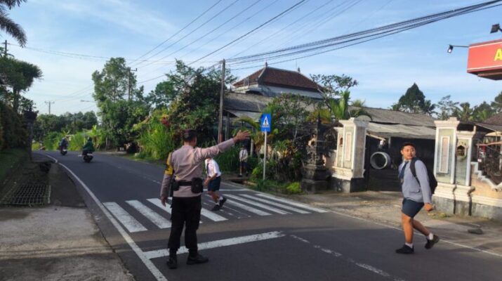 Personil Polsek Rendang Aipda I Made Ngasep melaksanakan pengamanan pengaturan lalu lintas atensi Anak-anak sekolah di SMP 2 Rendang menyeberang jalan raya serta menghimbau untuk berhati-hati dijalan raya agar tercipta situasi yang aman kondusif, selasa (28/10/2025)