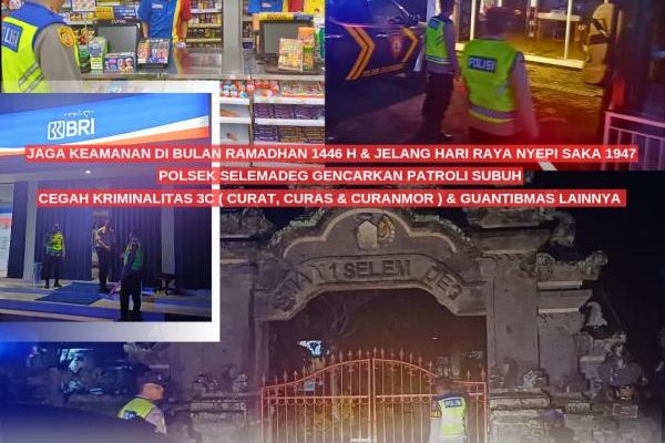 Gentra.co.id BaliĀ – Polres Tabanan – Polsek Selemadeg, Kamis, 06 Maret 2025, Pkl. 00.30 Wita s/d 03:00 Wita. Memasuki hari ke-7 bulan Ramadan dan menjelang Hari Raya Nyepi Caka 1947. Polsek Selemadeg gencarkan patroli subuh sebagai upaya menjaga keamanan dan ketertiban masyarakat (Kamtibmas) Patroli yang dipimpin oleh Pawas Iptu I Putu Eka Rai Putra, S.Sos. ini melibatkan tiga personel lainnya dan fokus pada pencegahan tindak kriminalitas 3C (Curat, Curas, Curanmor) serta gangguan keamanan dan ketertiban masyarakat (guantibmas) lainnya.