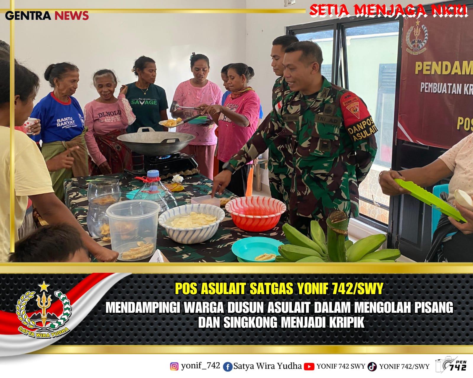 Gentra News NTT – Belu, Membantu membuka lapangan pekerjaan melalui UMKM, Satgas Yonif 742/SWY memperkenalkan warga Dusun Asulait cara mengolah pisang dan singkong menjadi kripik yang punya nilai jual guna meningkatkan perekonomian warga Perbatasan RI-RDTL, bertempat di Pos Asulait Satgas Yonif 742/SWY, di Dusun Asulait Desa Sarabau Kec. Tasifeto Timur. Selasa (9/7/2024)