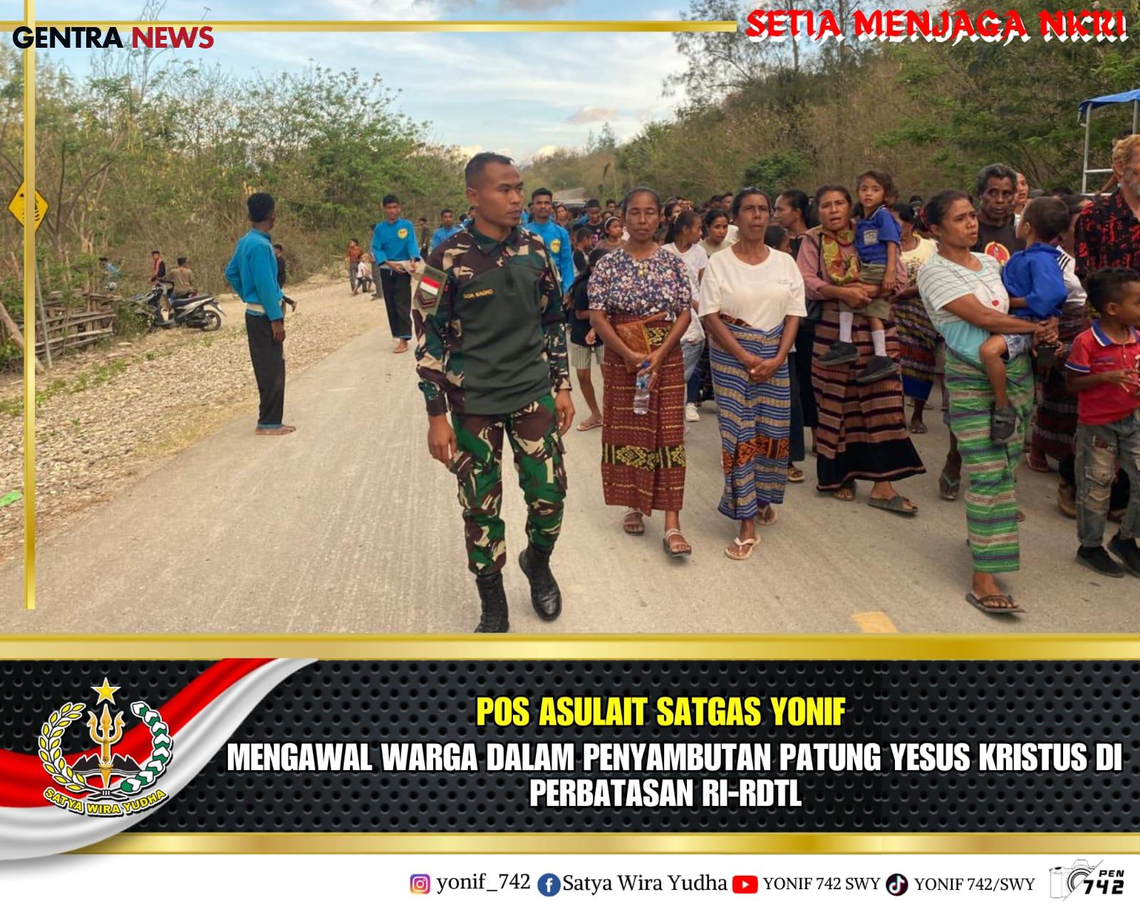 Gentra News NTT – Belu, Pos Asulait Kipam I Satgas Yonif 742/SWY mengawal warga perbatasan RI-RDTL di Dusun Asulait, Desa Sarabau, Kec. Tasifeto Timur, Kab. Belu yang melaksanakan kegiatan menyambut kedatangan patung Yesus Kristus. Senin (2/8/2024)