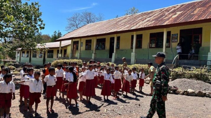 Oelbinose – Prajurit Satgas Pamtas RI-RDTL melaksanakan kegiatan anjangsana sekaligus membagikan buku bacaan keagamaan, serta melatihkan kedisiplinan di SDN Oelbinose yang berada di Desa Kasinifu, Kec. Mutis, Kab. TTU. Selasa (1/10)