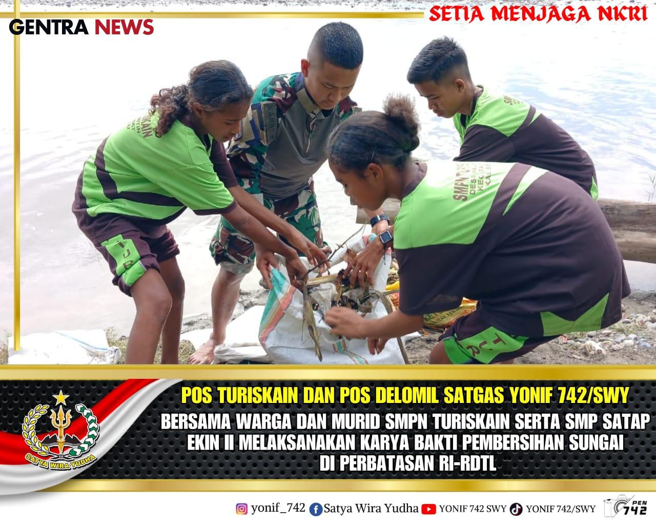 Gentra News NTT – Belu, Dalam Rangka memperingati Hari Sungai Nasional Pos Turiskain dan Pos Delomil Kipam II Satgas Yonif 742/SWY bersama warga serta Murid SMPN Turiskain dan SMP Satap Ekin II melaksanakan karya bakti pembersihan aliran Sungai dan penanaman pohon di tepi sungai Malibaka di Perbatasan RI-RDTL tepatnya di Dusun Dilagusun Desa Lamaksenuluh, Kec. Lamaknen, Kab. Belu, NTT. Minggu (28/7/2024)