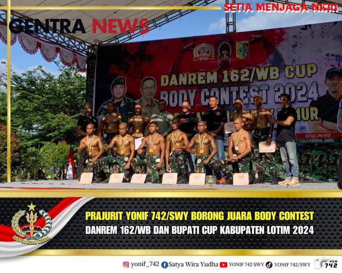 Kejuaraan Body Contest Danrem 162/WB dan Bupati Cup tersebut dilaksanakan dengan tujuan untuk menggali potensi atlet binaraga khusunya di wilayah Lombok. Pada event tersebut Prajurit Yonif 742/SWY memborong juara dibeberapa event kelas yang diselenggarakan. Diantaranya Class Junior Mens Fitnes/Beginer Pratu Ihwanton (Juara 2), Prada Dew Gede Swastika Loka (Juara 5), Prada Jihan (Juara 6). Class Mens Fitnes/New Muscle: Prada Arman (Juara 1), Prada Farhan (Juara 2), Prada Muhamad Erdiansyah (Juara 4), Prada Lalu Dane Dwi G (Juara 5), Prada Muh Apriadin (Juara 6), Serda Muhamad Deni (Juara 7), Prada Abimayu (Juara 8), Prada Ariansyah (Juara 9) dan Muhammad (Juara 10).