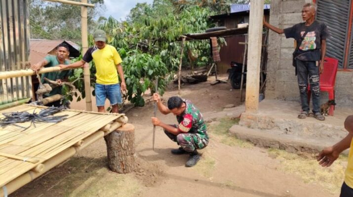 Ende, Babinsa Koramil 1602-04/Maurole, Praka Khairil Mustafa, melaksanakan kegiatan Pengamanan Wilayah (Pamwil) dan Karya Bhakti dengan membantu pengerjaan tenda acara adat di Desa Watunggere, Kecamatan Detukeli, Kabupaten Ende. Kegiatan ini berlangsung mulai pukul 08.45 WITA hingga selesai.