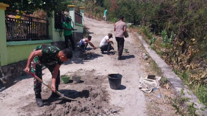NTT-SIKKA. Babinsa Koramil 1603-04/Kewapante, Kodim 1603/Sikka Pratu Yelfrid Leonardus, gotong royong bersama masyarakat memperbaiki jalan setapak yang rusak di Desa Wolomapa, Kecamatan Hewokloang, Kabupaten Sikka, Selasa(13/05/2025).