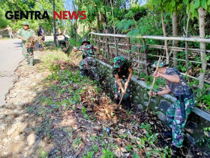 Anggota Koramil bersama masyarakat setempat bekerja sama membersihkan saluran air dari berbagai hambatan, seperti sampah plastik dan daun kering.