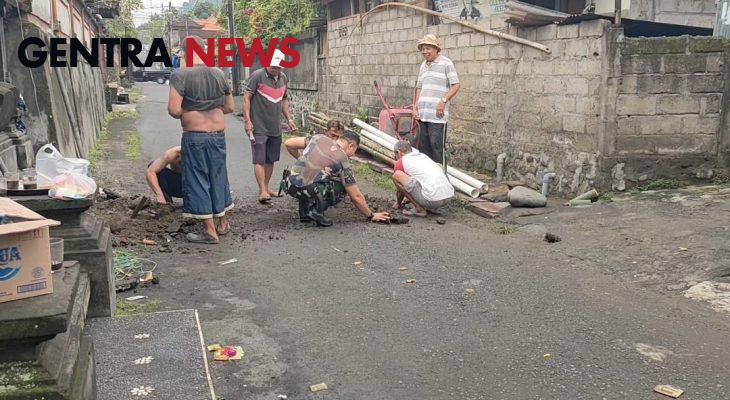 Gentra News Bali-Klungkung,- Banyaknya sampah yang menyumbat saluran irigasi di dusun Mengguna, sehingga air meluap dan menggenangi jalan mendapat perhatian khusus dari Babinsa Tihingan Sertu Putu Agustana.