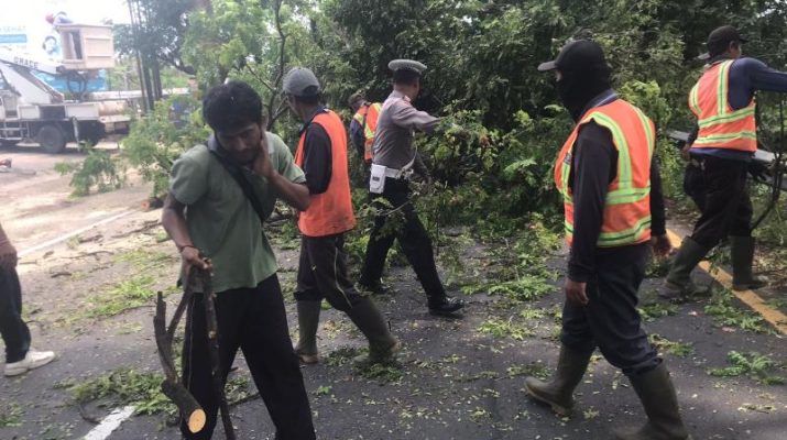 Personel membersihkan dahan pohon dan melakukan pengaturan lalu lintas untuk keamanan dan kelancaran arus lalu lintas saat dilakukannya pemangkasan pohon.