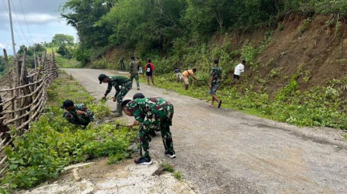 Satgas Pamtas RI-RDTL Sektor Barat Yonarhanud 15/DBY Pos Nelu Bersama Karang Taruna Bersihkan Jalan Raya di Desa Sunsea