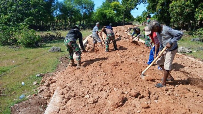 Masyarakat Desa Kaliuda bersama Satgas TMMD Kodim 1601/Sumba Timur terlihat terus bergotong royong meratakan tanah dengan menggunakan alat tradisional seadanya seperti gerobak dorong arco dan cangkul.