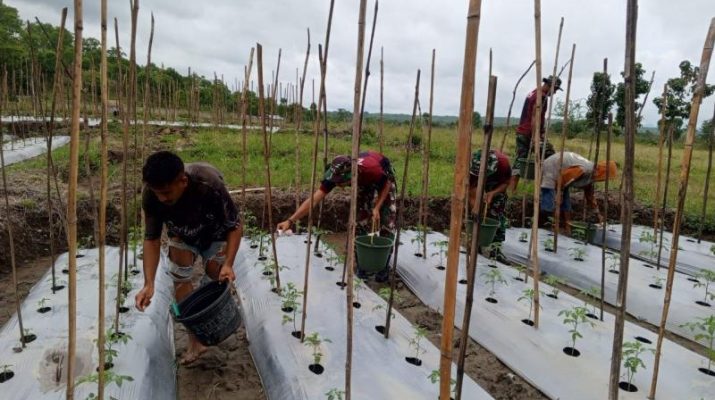 Gentra News NTT – Belu – Satgas Yonif 741/GN Pos Fatubesi membantu warga di daerah perbatasan dalam pemberian pupuk pada tanaman tomat di lahan persawahan milik Bapak Dominggus yang bertempat di Desa Takirin, Dusun Fatubesi, Kecamatan Tasifeto Timur, Kabupaten Belu. Sabtu (14/12/2024)