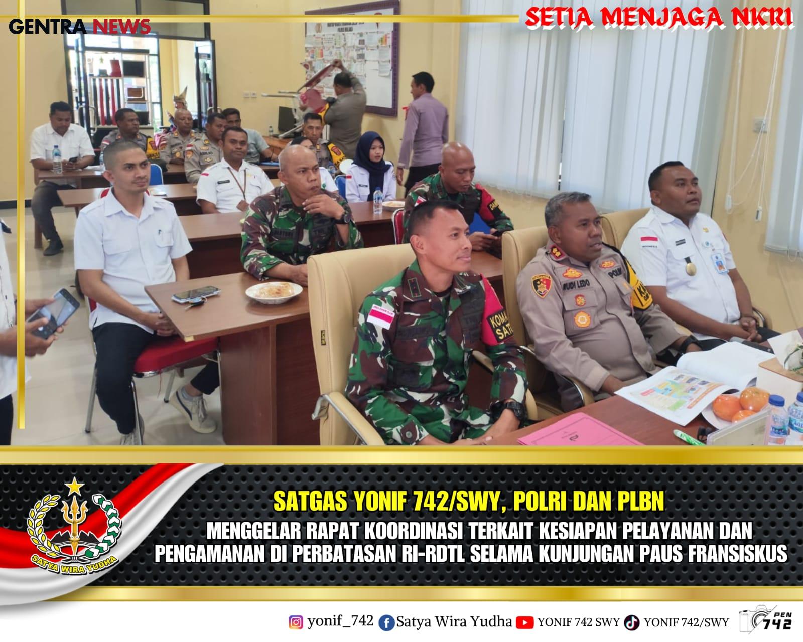 Gentra News NTT – Malaka, Satgas Pamtas RI-RDTL Sektor Timur Yonif 742/SWY menghadiri rapat terkait pelayanan dan pengamanan perlintasan umat Katolik dari Indonesia menuju Timor Leste dalam rangka Misa Kudus bersama Paus Fransiskus di Dili Timor Leste. Rapat tersebut dilaksanakan di Ruang Vidcon Polres Malaka Jl. Ahmad Yani, Desa Wehali, Kec. Malaka Tengah, Kab. Malaka. Rabu (4/9/2024)