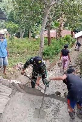 Gentra.co.id NTTĀ – So’e _ Ciptakan Semangat Gotong royong, Babinsa Koramil 1621-01/ Kota So’e Serda Agus Takesan Bersama masyarakat bahu-membahu membangun akses jalan desa Jalan Rabat Beton yang menjadi kebutuhan vital bagi warga di Dusun 1 RT/RW 002/001 , Desa Kuatae, Kabupaten TTS