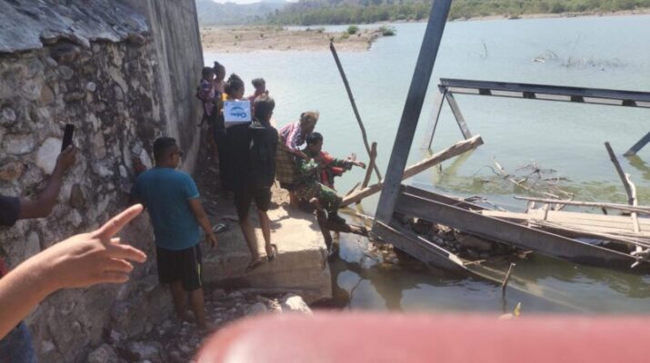 Kondisi sungai Termanu yang meluap membuat akses utama tidak dapat dilalui kendaraan, sehingga warga terpaksa menggunakan jembatan darurat untuk menyeberang. Melihat situasi berbahaya tersebut, Babinsa yang tengah melaksanakan patroli wilayah segera sigap membantu warga yang kesulitan menyeberang, terutama ibu dan anak-anak yang rentan terhadap risiko terpeleset atau terseret arus.