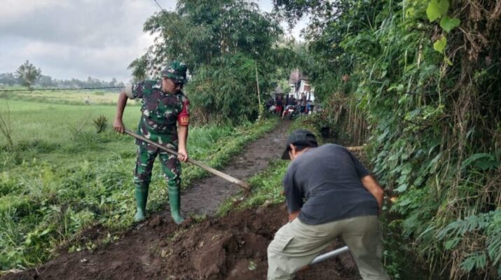 Bangli – Bertempat di Subak Puleai Banjar Tampuagan, Desa Peninjoan, Kecamatan Tembuku, Kabupaten Bangli Babinsa Desa Peninjoan Koramil 1626-03/Tembuku Kodim 1626/Bangli Sertu I Made Suarnika bersama masyarakat Subak Puleai melaksanakan kegiatan gotong royong pembersihan dan meratakan jalan usaha tani Subak Puleai menuju Subak Payuk yang akan di rambat beton. Senin (14/7/25)