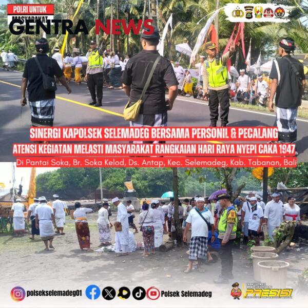 Gentra.co.id Bali – Polres Tabanan – Polsek Selemadeg, Senin, 24 Maret 2025, Pkl. 08:30 s/d 11:30 Wita. Kekompakan dan sinergi yang solid antara Kepolisian Sektor (Polsek) Selemadeg dan Pecalang setempat berhasil mengamankan pelaksanaan upacara Melasti dalam rangka menyambut Hari Raya Nyepi Caka 1947. Di bawah kepemimpinan Kapolsek Selemadeg, Kompol I Wayan Suastika, S.H., seluruh personil Kepolisian berkolaborasi erat dengan para Pecalang untuk memastikan kelancaran dan keamanan seluruh rangkaian ritual sakral yang berlangsung di Pantai Soka, Banjar Soka Kelod, Desa Antap, Kecamatan Selemadeg, Kabupaten Tabanan.