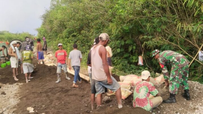 Selain itu, Babinsa juga turut serta dalam karya bakti pengerjaan rabat jalan, menunjukkan kepedulian langsung terhadap kebutuhan warga dan mendukung pembangunan infrastruktur desa.