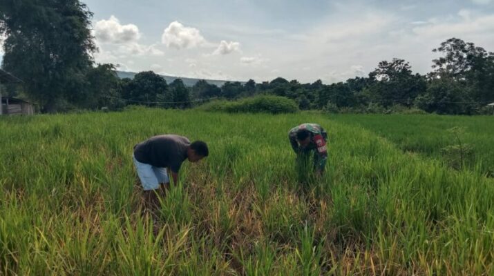 Pratu Irfan terlihat aktif membantu warga: membersihkan gulma yang mengganggu, mengontrol ketat aliran air irigasi untuk tanaman padi, hingga memastikan proses pendampingan berjalan akrab dan penuh silaturahmi.