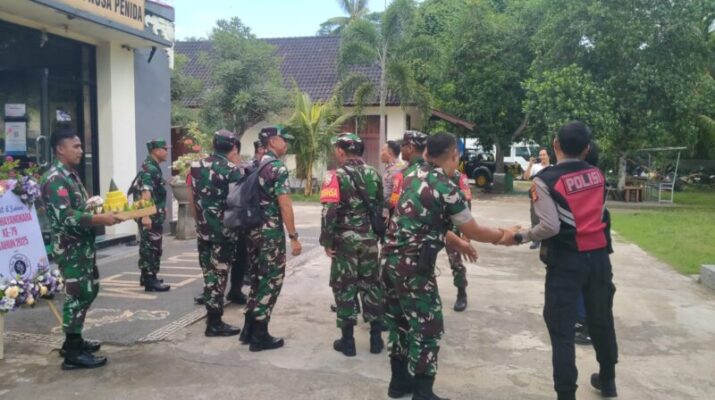 Dipimpin Serka Hamid Mukthar, personel Koramil 1610-04/Nusa Penida mendatangi Mapolsek Nusa Penida dengan membawa tumpeng.