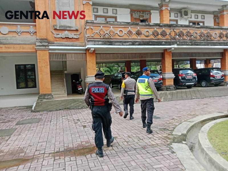 Personel dari Subsatgas Pam Obyek Penting Pemilu dalam operasi Mantap Praja Agung 2024 ini melaksanakan pengamanan di Kantor DPRD Kabupaten Klungkung, yang beralamat Jl. Raya Besakih, Semarapura Tengah, Klungkung, (22/10/2024).