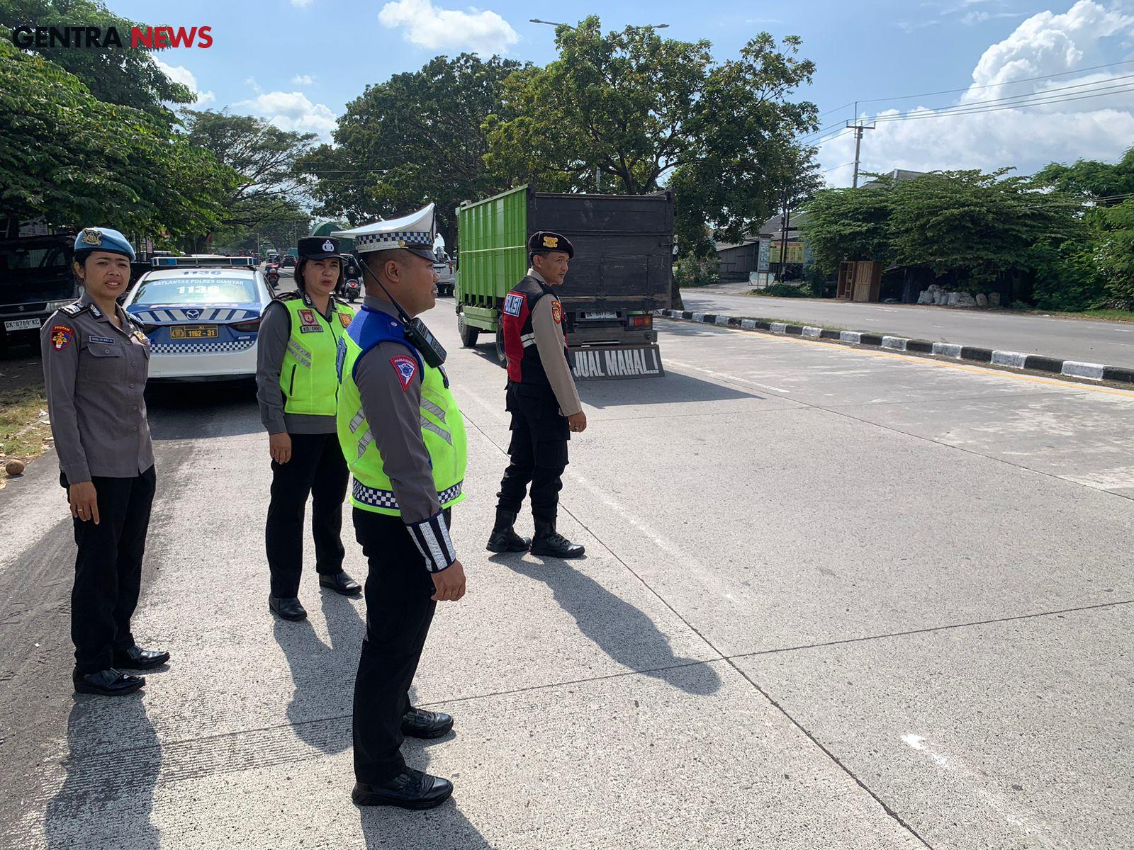 Gentra News Bali – Gianyar, Sub satgas Turjag Satgas Preventif Ops Patuh Agung 2024 melaksanakan penjagaan dan pengaturan arus lalu lintas di jalan masuk Bypass Ida Bagus Mantra Sukawati dalam rangka Operasi Patuh Agung-2024 yang dipimpin oleh Kasubsatgas Turjag Ipda Wayan Karyawan, 26/7/2024,