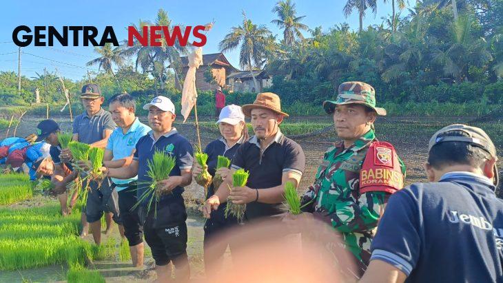 Gentra News – Bersama kelompok tani warga desa setempat, Babinsa Desa Kaliakah Koramil 1617-01/Negara Serda I Putu Eka Adnyana Bersama Bhabinkamtibmas Aiptu Made Ariawan Tanam Padi Inpari 32, Babinsa Serda I Putu Eka Adnyana bersama aparatur desa setempat melaksanakan tanam padi perdana Varietas Inbrid Padi Irigasi (Inpari) 32 diatas lahan seluas 5 hektar Dalam Rangka Program Ketahanan Desa Tahun 2024. Bertempat di Subak Munduk ,Banjar Kaliakah, Desa Kaliakah, Kecamatan Negara, Kabupaten Jembrana.