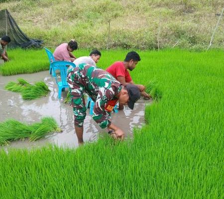 Gentra.co.id NTTĀ – Babinsa Koramil 04/Tabundung, Kodim 1601/Sumba Timur. Pratu Denis Nduru Peta, membantu petani dalam pencabutan bibit Padi di sawah milik bapak Kalikit Jara Nau, di Dusun Palapang,Desa Karita, kecamatan Tabundung, kabupaten Sumba Timur, Selasa (07/01/2025).