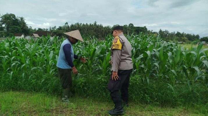 Bhabinkamtibmas Desa Singakerta Aiptu I Made Widastra melaksanakan pendampingan kepada petani dalam merawat jagung milik warga di Banjar Lodtunduh Desa Singakerta Kecamatan Ubud Kabupaten Gianyar.