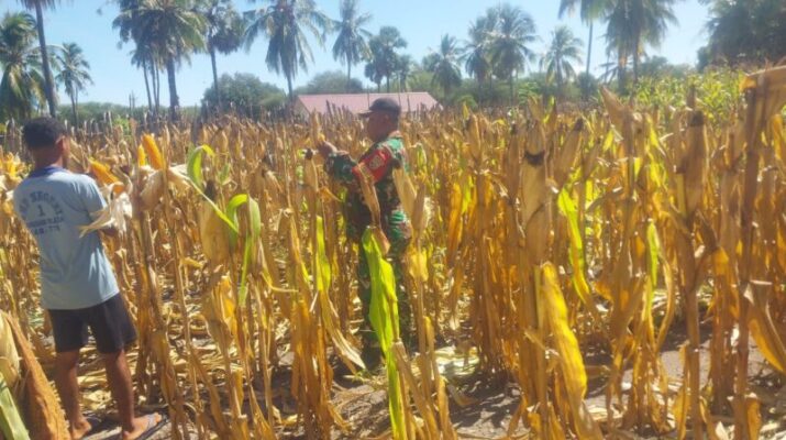 TTS _ Babinsa Koramil 05 Panite Jajaran Kodim 1621 TTS, Serka Fransiskus Maryono membantu petani dalam memanen jagung di lahan milik salah seorang warga Alexander Benu salah seorang petani di desa Kuanfatu kecamatan Kuanfatu, kabupaten Timor Tengah Selatan, Jum’at (02/05/2025).