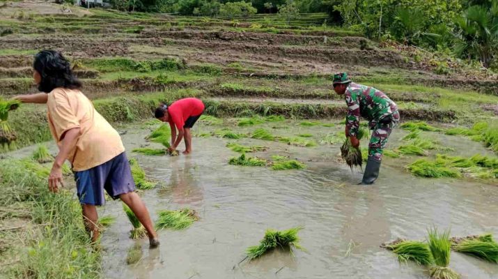 Gentra News NTT – KODIM 1605/BELU, Babinsa Desa Kapitan Meo Koramil 1605-05/Kobalima Kopda Arnoldus Manek dampingi petani di sawah dalam proses mencabut dan memindahkan