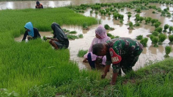 Gentra News NTT – KODIM 1605/BELU, Serda Yudha M Nur Babinsa Desa Lakekun Barat Koramil 1605-05/Kobalima melaksanakan pendampingan membantu Bapak Luis Taek menanam padi