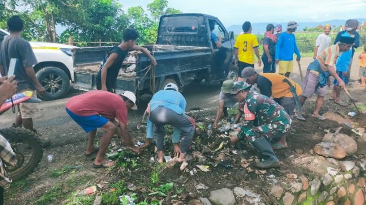 Babinsa Koramil 03/Hu’u, Gotong Royong Pembuatan Drainase (Saluran Pembuangan Air) di Wilayah Binaan
