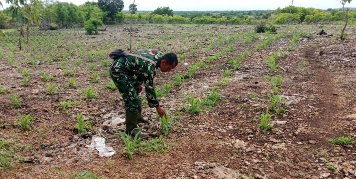 Gentra.co.id NTT – Babinsa Koramil 02/Rindi Umalulu jajaran Kodim 1601/Sumba Timur Serka Fajarudin mendampingi petani Mengecek pertumbuhan Tanaman Jagung dan kacang tanah yang berada