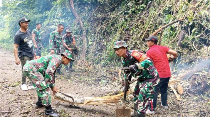 Gentra.co.id Bali – Tabanan – Personel Koramil 1619-07/Baturiti bersama masyarakat setempat bahu-membahu membersihkan pohon tumbang dan material tanah longsor yang menghalangi akses jalan utama di