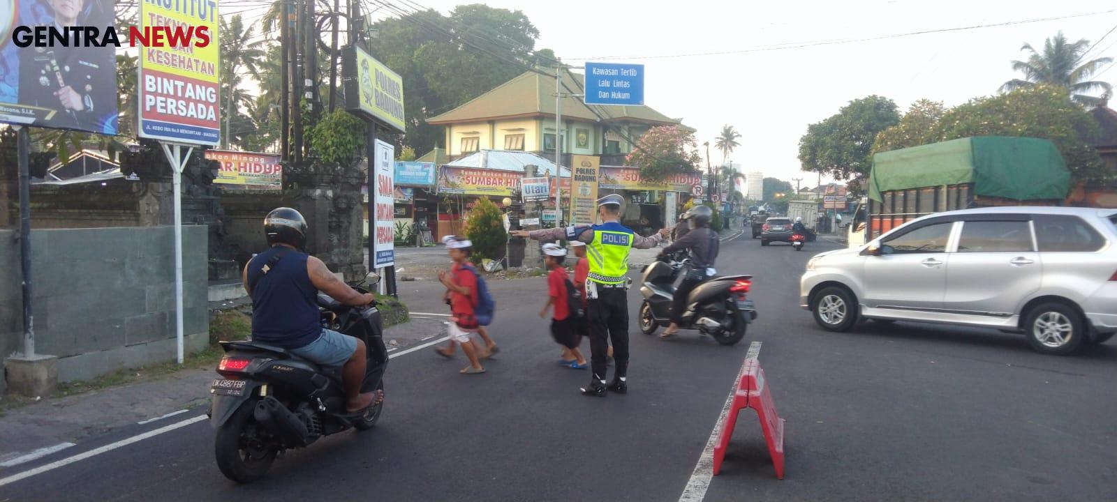 Tampak personel Patroli Sat Lantas Polres Badung Bripka I Nyoman Suparta, SH turun langsung melakukan pengaturan arus lalu lintas yang saat itu situasi arus lalu lintas mulai ramai disekitar lokasi tersebut, disela-sela sibuk mengatur arus lalu lintas nampak anak – anak akan berangkat ke sekolah mau menyeberang jalan raya yang padat akan arus lalu lintas, Bripka I Nyoman Suparta dengan sigap langsung memberikan bantuan dengan menghentikan kendaraan dan membantu menyeberangkan anak-anak tersebut menuju keseberang jalan.