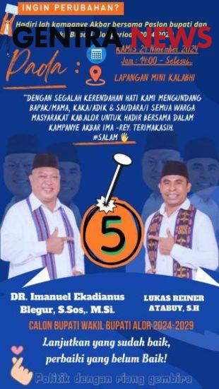 Wakil Ketua Milenial dan Tim Kampanye Paslon Nomor Urut 5 IMA-REY, Gamalial Wabang kepada media ini via selulernya mengatakan kampanye akbar rencananya akan digelar pada Kamis 21 November di lapangan Mini Kalabahi.