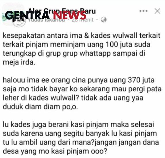 Gentra News, NTT-ALOR – Gerbong Tim pemenang Paslon IMA-REY sesali salah satu yang terindikasi sebagai penyebaran Hoaks yang berpotensi pada fitnahan kepada personal Imanuel Blegur melalui akun Facebook Yudas Iskariod yang diposting di Alor Grup Fans Baru.