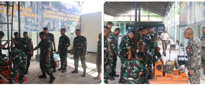 Kegiatan dilanjutkan usai makan siang dengan sesi praktik lapangan di garasi serbaguna Kodim 1604/Kupang. Dalam sesi ini, para peserta diperkenalkan langsung dengan alat dan mesin yang digunakan dalam pembuatan pompa hidram dan sumur bor. Latihan ini bertujuan agar peserta tidak hanya memahami teori, tetapi juga mampu mengaplikasikan secara langsung di lapangan.