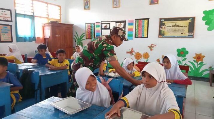 Dompu, NTB – Babinsa Kelurahan Simpasai, Koramil 1614-01/Dompu, Sertu Arifudin melaksanakan pendampingan sekaligus pemantauan penyaluran logistik Bantuan Gizi Nasional (BGN) di SDN 02 Simpasai, Kecamatan Woja, Kabupaten Dompu pada Kamis, 21 Agustus 2025.