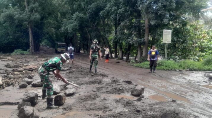 Flotim — Babinsa Koramil 1624-06/Wulanggitang DPP Serda Rifen Lassa bersama personel Polsek Boru melaksanakan aksi tanggap darurat terhadap bencana lahar dingin yang terjadi di wilayah Kecamatan Wulanggitang. Material batu dan lumpur dari banjir lahar dingin Gunung Lewotobi Laki-Laki menutup ruas jalan poros negara yang menghubungkan Desa Dulipali, Desa Hokeng Jaya, dan Desa Boru, Rabu ( 03/12/2025 ).