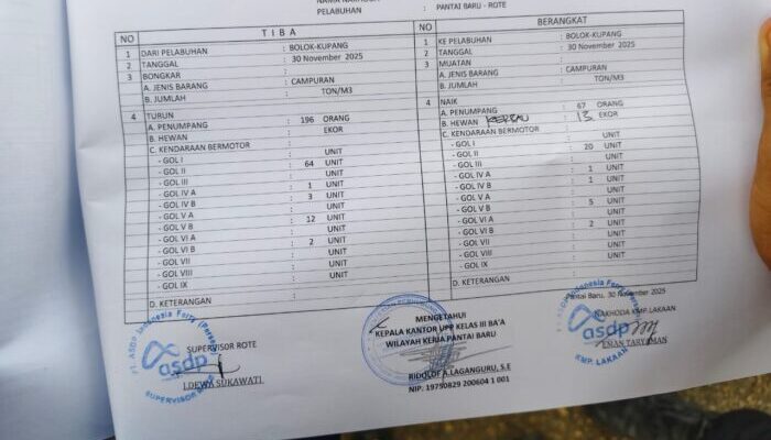 Rote Ndao — Upaya memastikan keamanan dan kelancaran transportasi laut terus dilakukan oleh jajaran TNI AD, khususnya para Babinsa yang bertugas di wilayah pesisir. Pada Minggu, 30 November 2025, Babinsa Koramil 1627-03/Pantai Baru, Sertu Apriadi Lonowata, melaksanakan kegiatan pengamanan dan pemantauan langsung di Pelabuhan ASDP Pantai Baru, Desa Ofalangga, Kecamatan Pantai Baru, Kabupaten Rote Ndao.