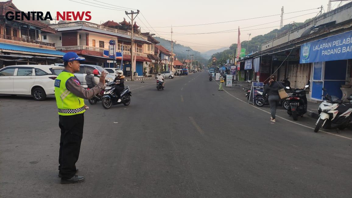 Personil Polsek Padangbai melakukan pengaturan lalu lintas dan pengamanan di simpang Tri Putra dab Simpang Pura Pesamuhan Desa Padangbai untuk membantu masyarakat yang akan nyebrang jalan dan untuk melancarkan arus lalu lintas, sebagai langkah antisipasi terjadinya pelanggaran maupun laka lantas.