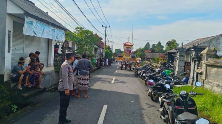 Gentra.co.id Bali – Polsek Marga, Bhabinkamtibmas desa tua, Polsek marga, polres Tabanan Aiptu I Kadek Wardana melaksanakan pengamanan dan pengaturan lalin dalam rangka upacara ngaben almarhum Ni Nyoman Sukartini, perempuan, 47 th, meninggal karena sakit, warga banjar cau, desa tua, kec marga, kab tabanan