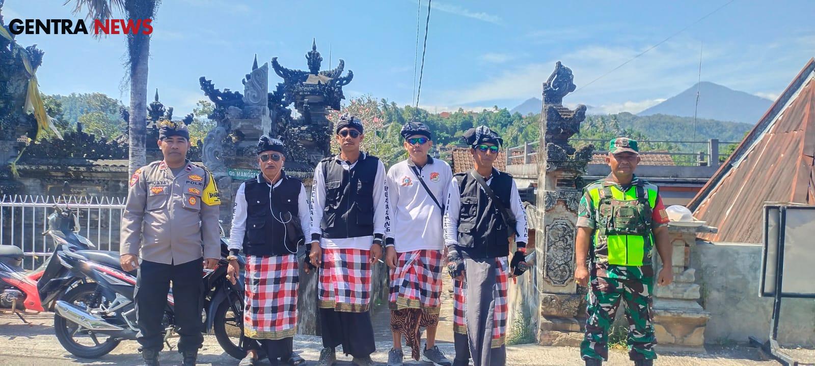 Babinsa desa subuk an Serka komang mahayasa bersama Babinkambtibmas desa subuk an Ipda Ida komang wijaya melaksanakan pengamanan upacara ngenteg linggih dan pemelastian ke pantai labuan aji desa temukus kec Banjar kab buleleng .