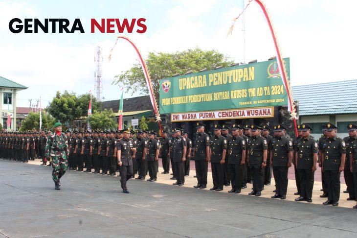 Gentra News Bali-TABANAN-BALI. Danrindam IX/Udayana Kolonel Inf Wirawan Eko P., S.E., M.H., pimpin upacara penutupan Prodi Pendidikan Pembentukan Bintara Khusus (DIKTUKBASUS) TNI AD TA 2024 di Lapangan Wira Yudha Bhakti Rindam IX/Udayana, Senin (2/9/2024).