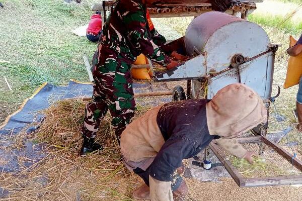 NTT – Ende/Lio Timur, Babinsa Koramil 02/Wolowaru Kopda Hardianto membantu petani yang merupakan warga binaan menggiling padi menggunakan mesin penggiling Kelurahan Bokasape, Kec. Lio Timur, Kabupaten Ende, Senin (23/06/2024).