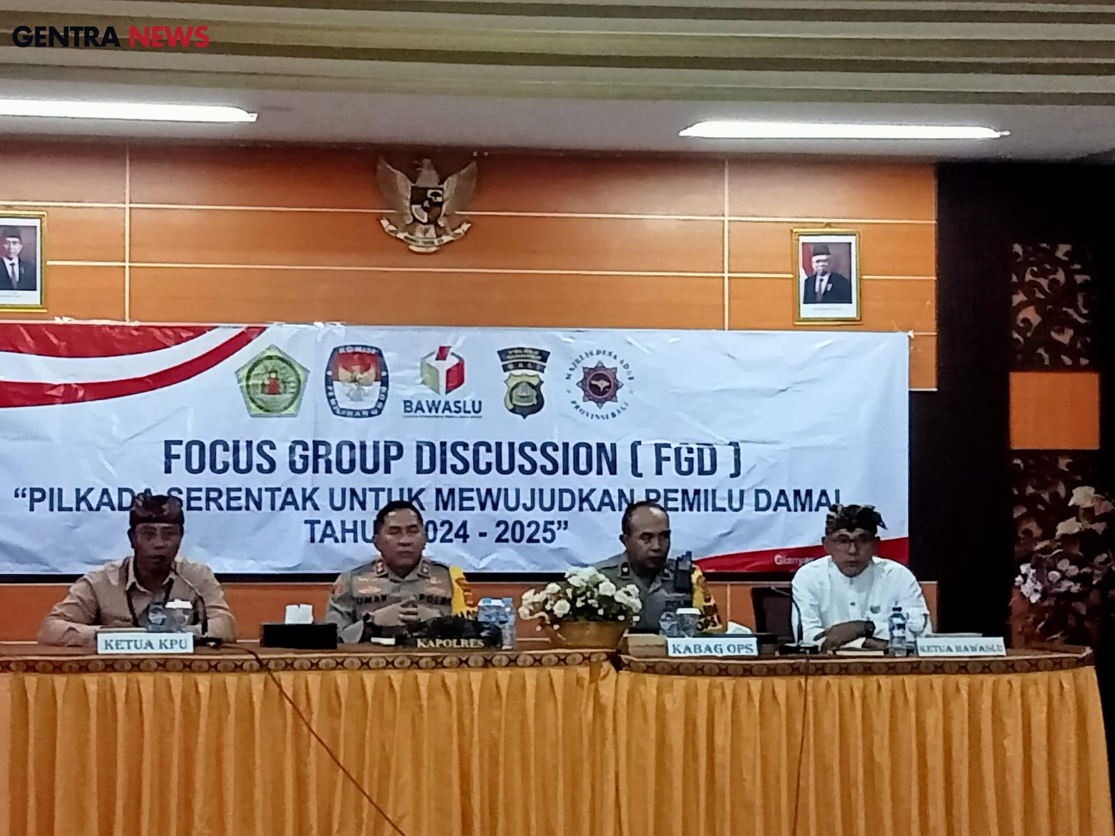Gentra News GIANYAR – Dalam rangka mewujudkan Terjaganya Harkamtibmas Jelang Pilkada Serentak 2024, Polres Gianyar menggelar Forum Group Discussion (FGD) dengan Thema “Pilkada serantak untuk Mewujudkan Pemilu damai Tahun 2024-2025”, bertempat di Aula Tri Brata Polres Gianyar. Jumat, 26 Juli 2024.