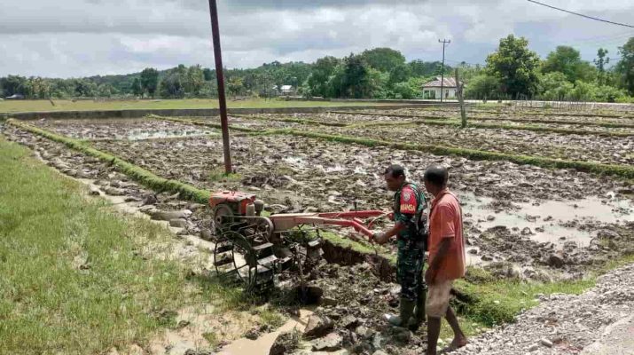 Gentra News NTT – KODIM 1605/BELU, Tingkatkan ketahanan pangan, Serda Hironimus Kono Babinsa Desa Umaklaran Koramil 1605-07/Wedomu membantu membajak lahan sawah milik Bapak Pius Ati, salah seorang petani di Dusun Banleten, Desa Umaklaran, Kecamatan Tasifeto Timur, Kabupaten Belu, Sabtu (11/1/2025).